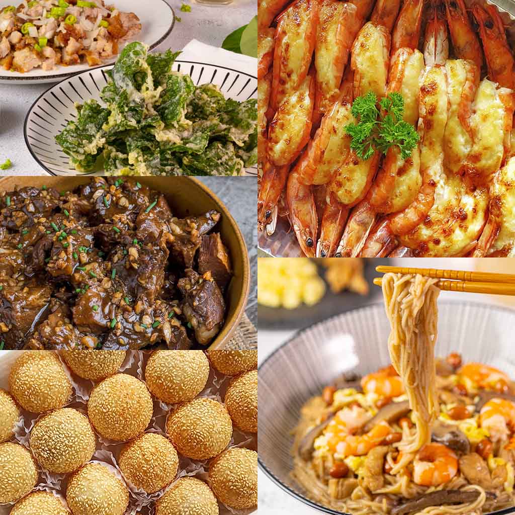 Crispy kangkong, Sisig, Beef Salpicao, Buchi, Baked Cheesy Garlic Prawns, and Misua