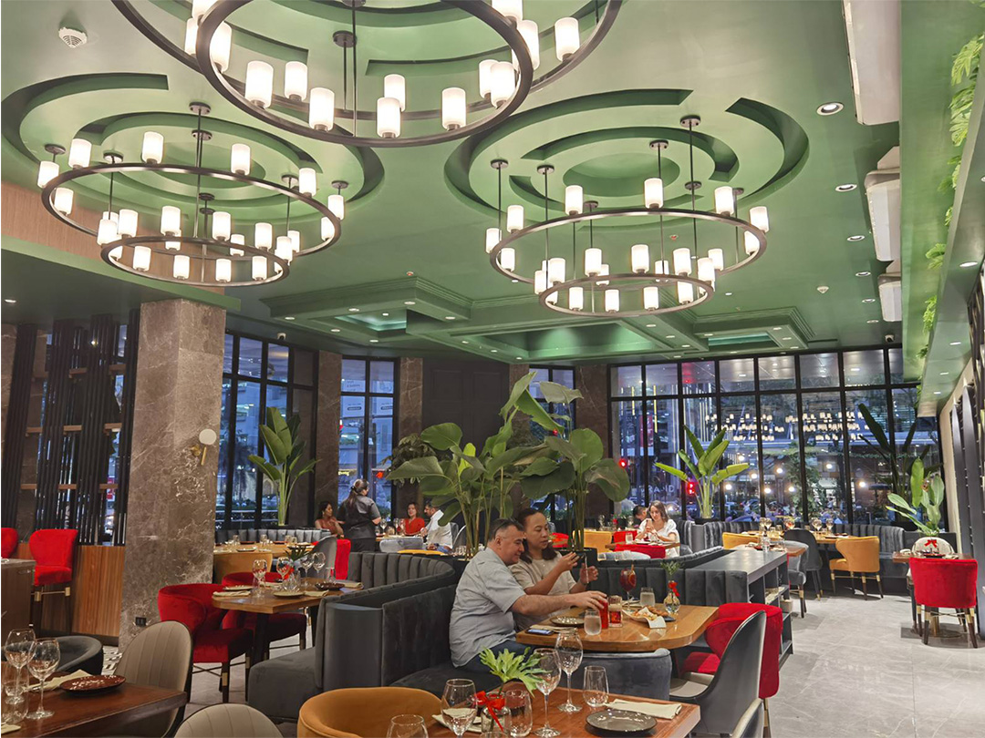 The Spanish tapas bar combines sleek dome pendant lights with tasseled floor lamps that are reminiscent of old lighting fixtures from your grandma’s house. In similar fashion, Las Flores’ tapas, paellas, and cocktails take the guest on a historical trip as it presents soulful yet contemporary Spanish dishes like specialty tapas Conos de Tartar de Salmon and Pulpo a la Gallega.