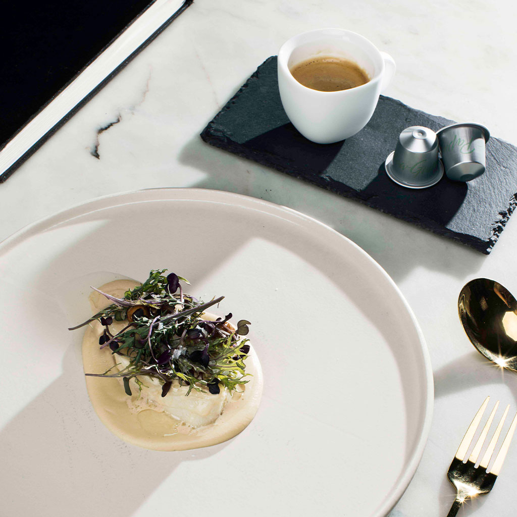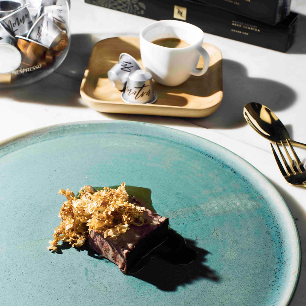 In creating the plate that would complement Master Origins Aged Sumatra, the executive chef took note of its robust and wonderful woody aroma by pairing it with roasted flavors. “We want it to be a little bit more delicate and bring in some chocolate tones that will linger, and also incorporate an aged process,” says Boutwood. A delicate serving of a tender and aged short rib, cacao, and cauliflower married the hearty flavors so well.