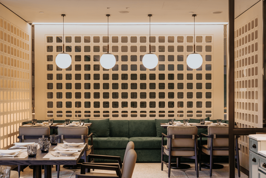 Osteria Mozza’s interiors feature rustic elements reminiscent of a Tuscan farmhouse, with its open kitchen, stacks of firewood, gabion stone walls, and natural brick screening.