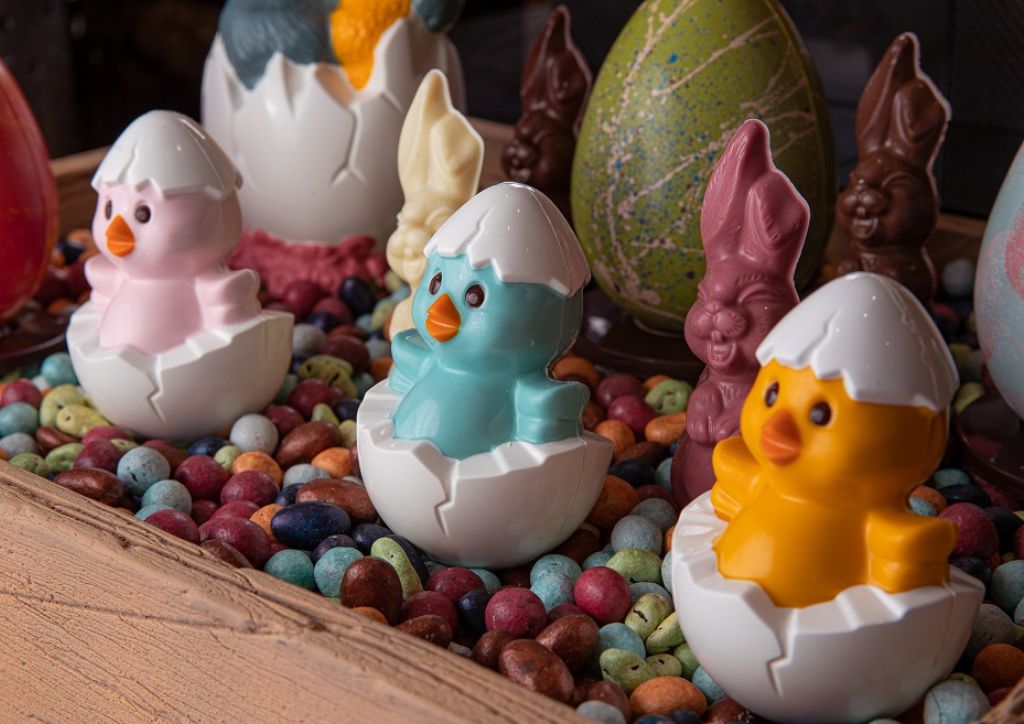 These include Easter bunny and duck chocolates, colorful eggs with pralines, small bunny chocolates in flavor variants (white, dark, milk, ruby), chocolate chicks, chocolate eggs in meringue nest, cookies and cream tiles, and cherry gianduja bars, among others.