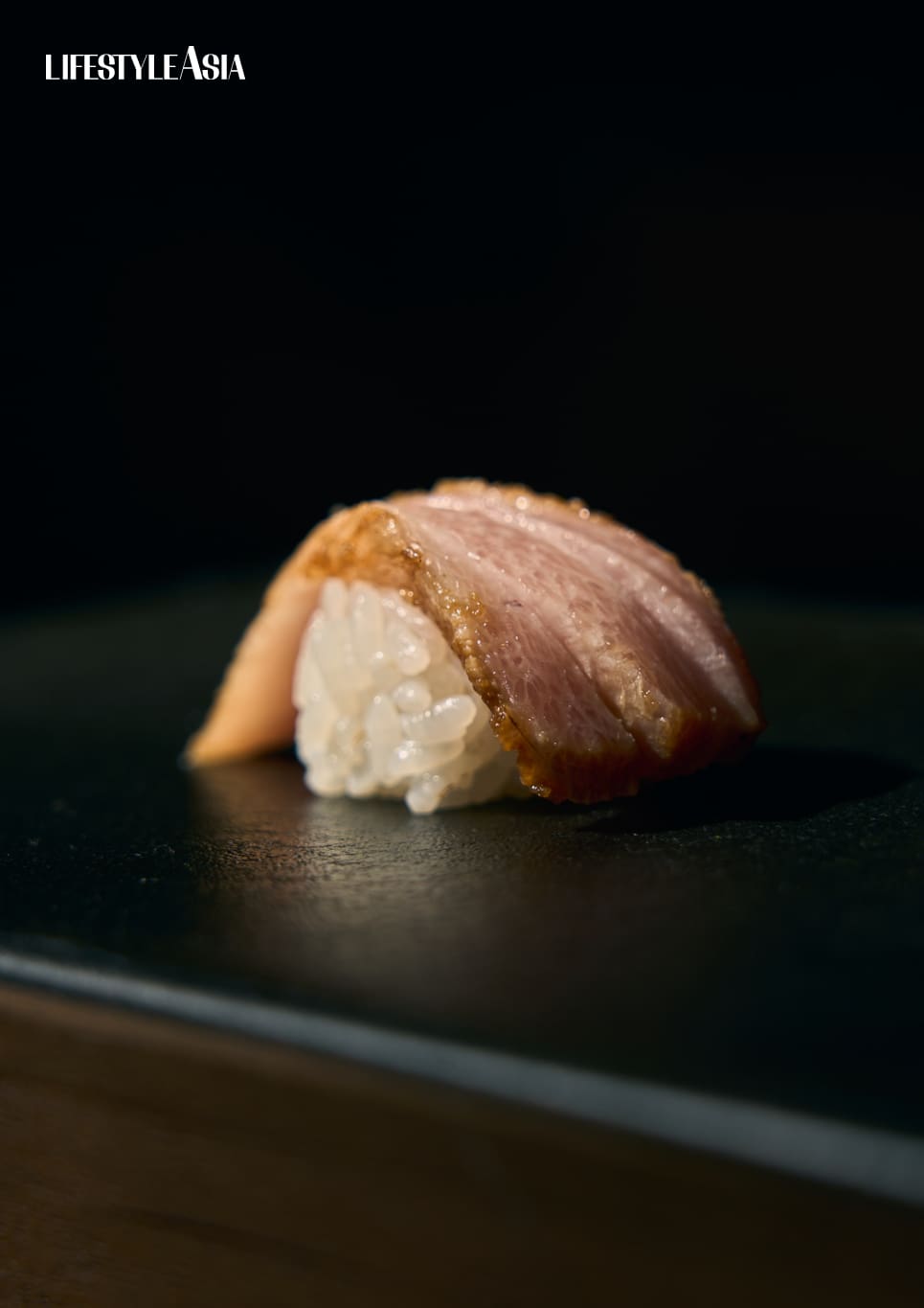 “In the counter is where you can experience the nigiri made piece by piece, and then we serve it on a geta, which is the ceramic that we put sushi down on,” the chef elaborates. The geta derives its name from the traditional Japanese footwear made from wood, due to its platform-like qualities. In many high-end sushi restaurants, chefs typically place it on the counters, using it as a stage for the sushi they make.