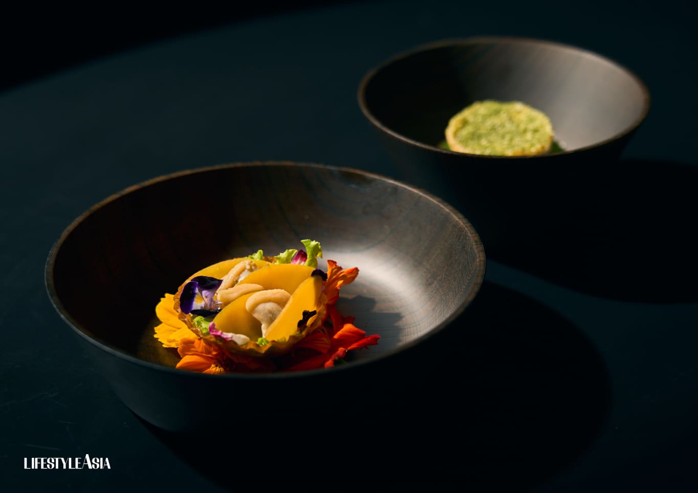 Engaging visuals are as crucial as flavor, exemplified by the Tiula Itum, an appetizer that takes inspiration from the chef’s recent Basilan trip. Placed on a unique silver platter, it features a taro puff with a filling of octopus, bell peppers, and coconut milk, reminiscent of its namesake dish (a Tausug soup). Its accompanying course is Chawanmushi (steamed egg custard) with king crab, abalone, Hokkaido uni (sea urchin), and a dollop of caviar. The eye-catching appetizers also included a pairing of Oyster Croustade (a dashi-based pie tart with a creamy oyster filling) and Clam Tart (roasted squash, zucchini puree, pickled squash, and clam ceviche), which were picturesque and refreshing starts to the roster of courses.