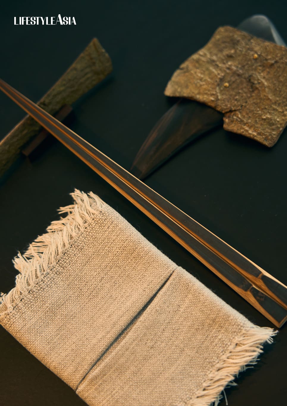 “Japan is such a massive inspiration, but it was important for me to localize it in the Philippines and where we are,” Jae adds. For instance, she was looking to incorporate the technique of shou sugi ban, where wood is charred with fire to preserve it and protect it from the elements. While Iai’s wood paneled walls don’t feature shou sugi ban, they still bear its captivating charcoal-like color and texture through dehydrated panels of banana tree trunks that were painted black. Meanwhile, napkins are made of traditional inabel fabric from Ilocos; certain wood elements are made from kamagong (known for its density and durability); and the spell-binding lamps (one of the first things people will notice when they see Iai from the outside) are made by Indigenous PH—a social enterprise company that works with indigenous communities to create products from sustainable materials.