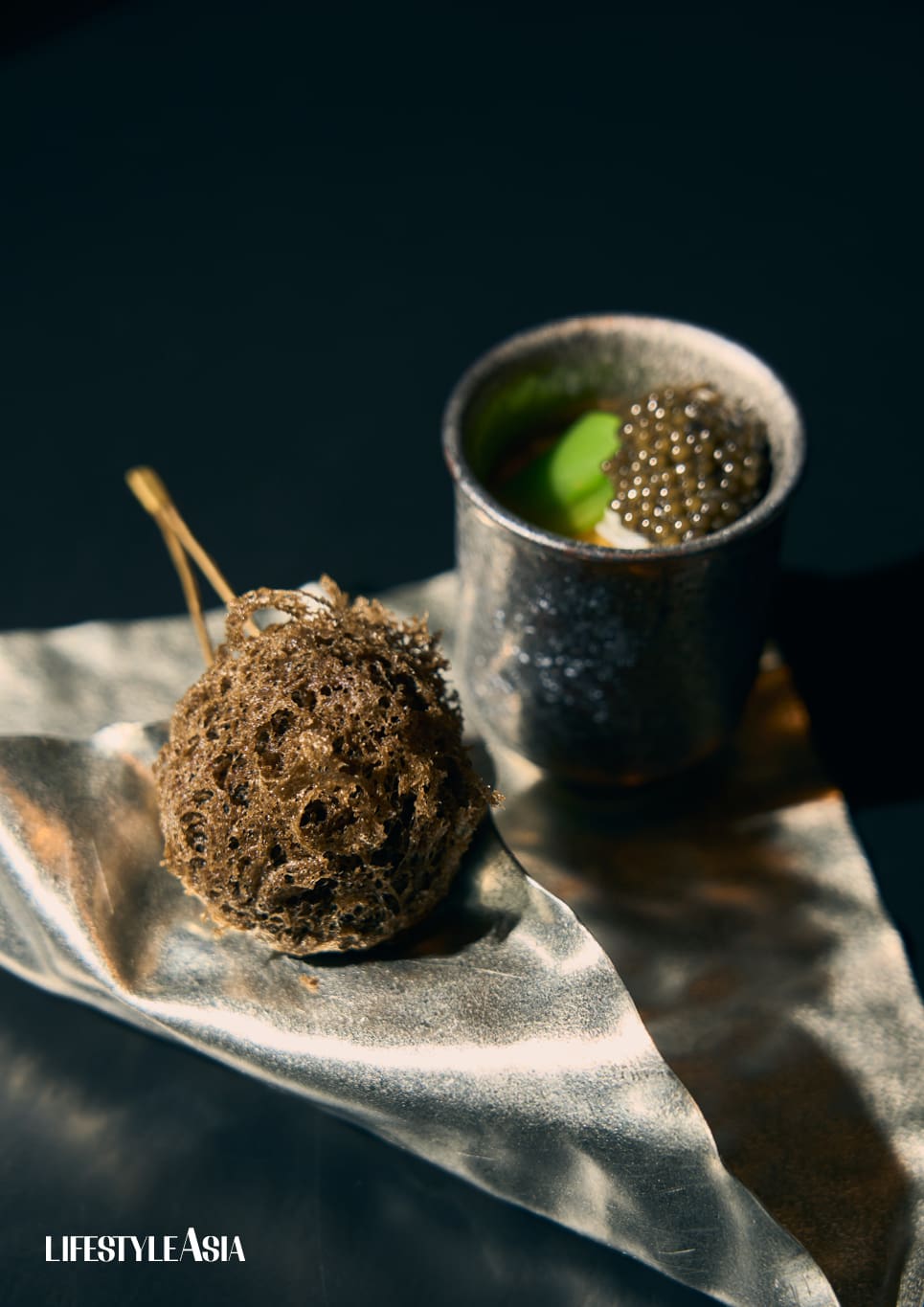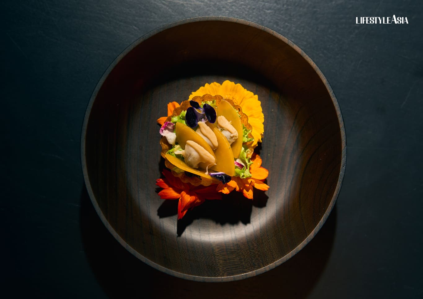 Engaging visuals are as crucial as flavor, exemplified by the Tiula Itum, an appetizer that takes inspiration from the chef’s recent Basilan trip. Placed on a unique silver platter, it features a taro puff with a filling of octopus, bell peppers, and coconut milk, reminiscent of its namesake dish (a Tausug soup). Its accompanying course is Chawanmushi (steamed egg custard) with king crab, abalone, Hokkaido uni (sea urchin), and a dollop of caviar. The eye-catching appetizers also included a pairing of Oyster Croustade (a dashi-based pie tart with a creamy oyster filling) and Clam Tart (roasted squash, zucchini puree, pickled squash, and clam ceviche), which were picturesque and refreshing starts to the roster of courses.
