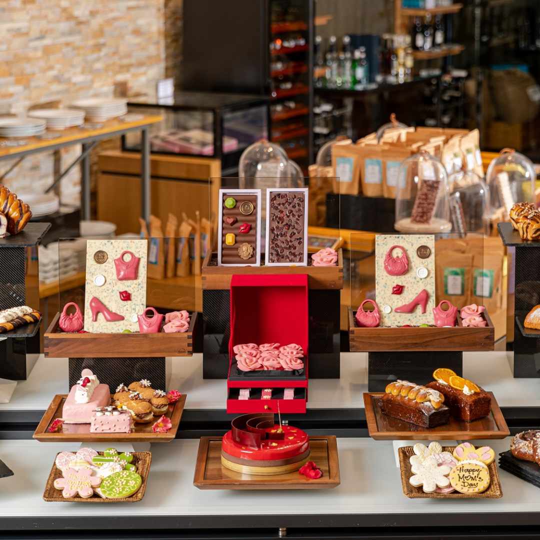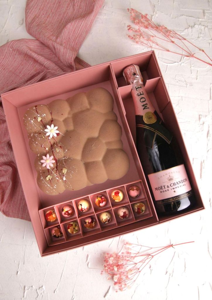 Their “out of the box” treat, however, is a pink Mother’s Day gift box containing a coffee-flavored macchiato spray cake, a dozen chocolate mendiant bites, and a bottle of wine.