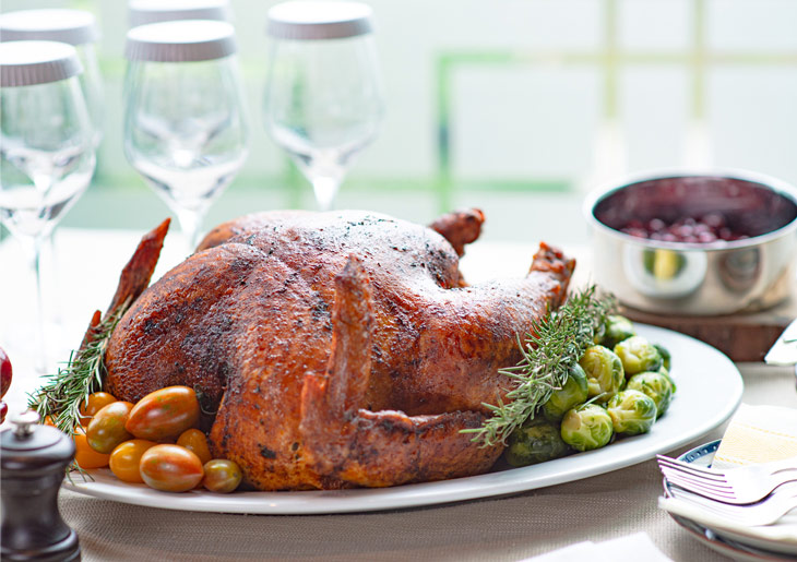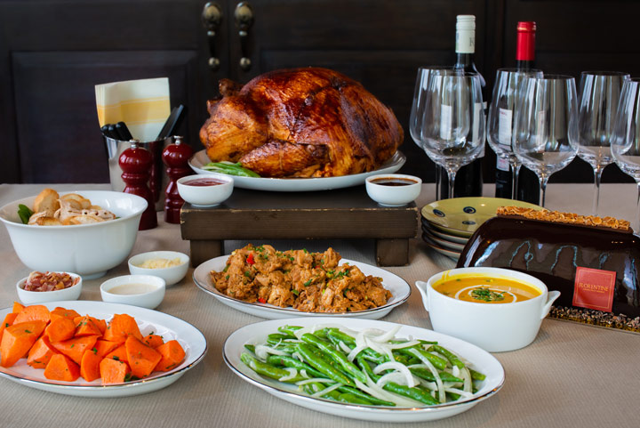 Selections among the three cuisines include Roasted Pumpkin Soup, Seafood Chowder, Caesar Salad, Braised Crabmeat Soup, and Hot & Sour Chicken Soup for appetizers; and Vegan Lasagna, Slow-Smoked Barbeque Beef Brisket, Roasted Butterball Turkey, Traditional Peking Duck, and Crispy Lemon Chicken for main course items. The Vegan and Western menus also include dessert options including a Whole Vegan Chocolate Brownie, Strawberry Cheesecake, and Chocolate Cake.