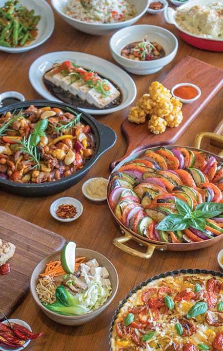 Patrons can choose from Vegan, Western, and Chinese set meals, which include appetizers and main course platters.
