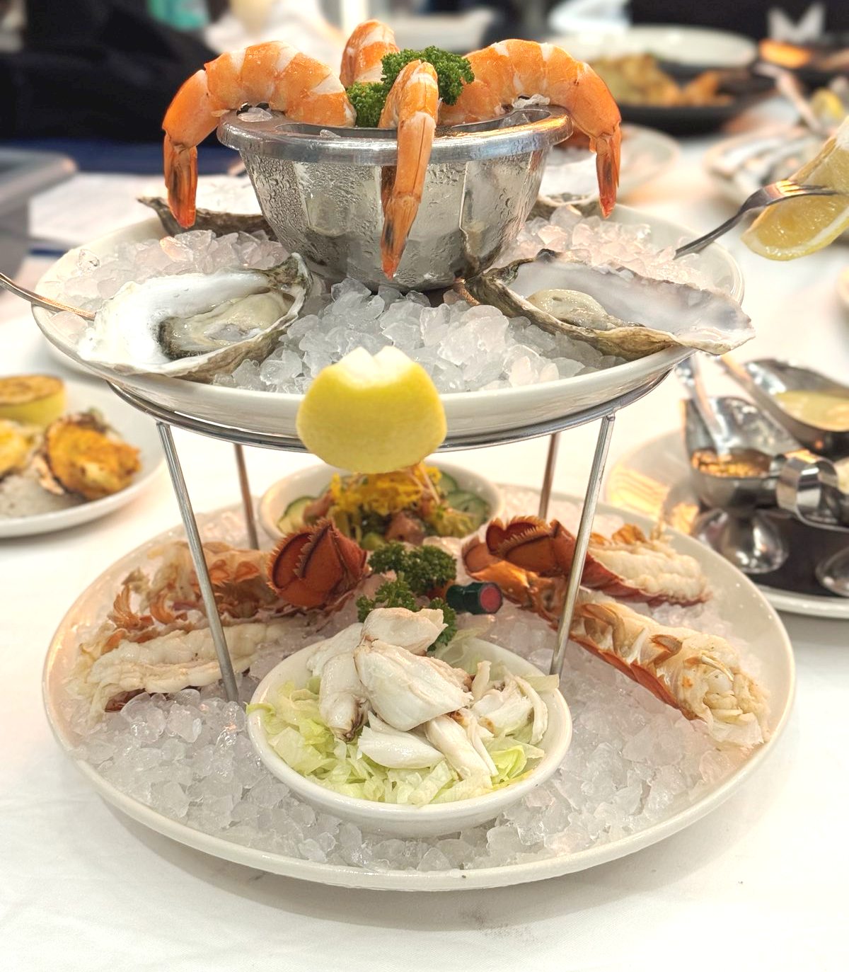 The Filet Mignon, a signature dish, can be paired with Maine Lobster Tail. Other popular dishes include bacon wrapped sea scallops, crab cakes, prawn cocktail, and bacon steak. One can enjoy any steak “Oscar Style” too, pairing your prime meat with Jumbo Lump Crab Meat with Asparagus and Béarnaise sauce. Delicacies of the sea are served at Morton’s like the decadent Maine Lobster Tail and Prime Ocean Platters which feature an assortment of seafood, best enjoyed chilled or baked.