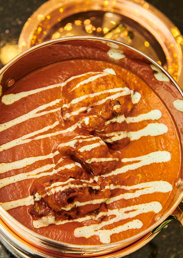 As I waited for the next serving, I was given a glass of mango lassi. Lassi is the regional name for buttermilk, a yogurt-based drink with water, spices, and fruit. As the name implies, I ordered the version mixed with fruit. Topping the drink was an edible paper with a mandala pattern printed on it. Alberto jokes that first-time visitors usually ask, “Is this a coaster?”
