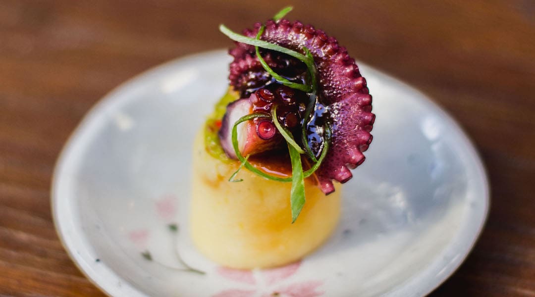 An appetizer dish of Tuna Latke was the next plate served. The dish was a playful mix of textures, with a tender seared tuna sitting atop a crispy potato pancake with huancaina sauce, cilantro and lemon. To round up the first batch of courses, Taco Causa was then brought out of the kitchen. This dish consists of guacamole, octopus confit, panka-miso sauce, and chives. Although the description makes it sound like more of a Peruvian dish, the fresh seafood aspect gave it the right balance of Oriental flavors. Appetizer dishes were paired with Laurenz V Singing Gruner Veltliner, a wine from Austria, made with much finesse.