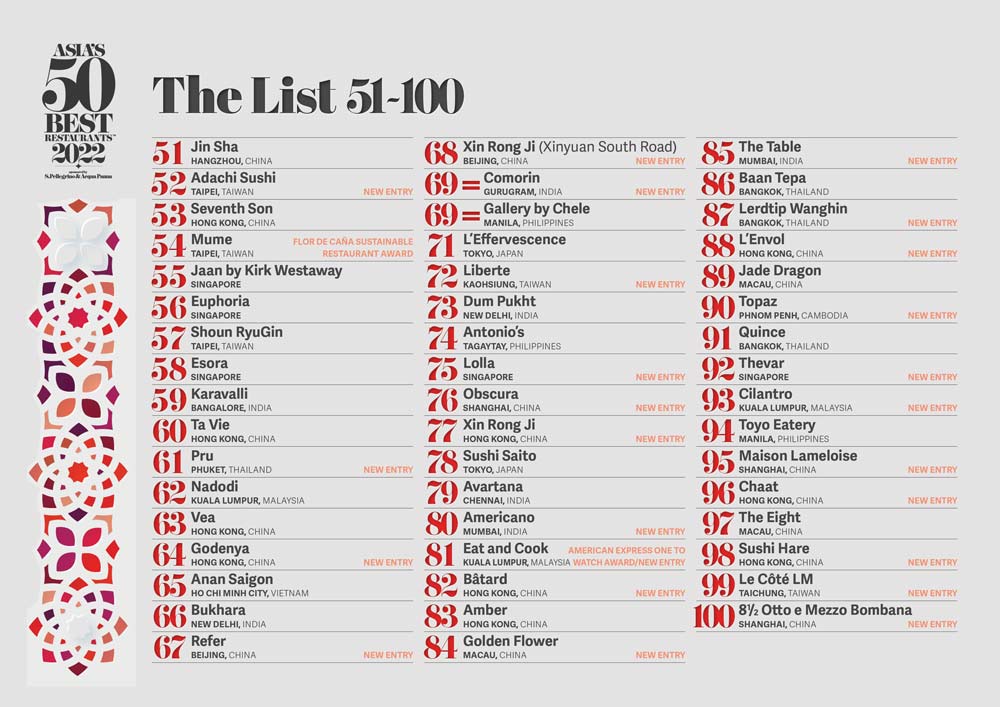“This year’s 51-100 list features 25 new entries and turns the spotlight on the region’s emerging talent,” William Drew, director of content at Asia’s 50 Best Restaurants, says. “We’re thrilled to share this list to showcase the breadth and diversity of Asia’s gastronomic scene as well as new culinary trends.”