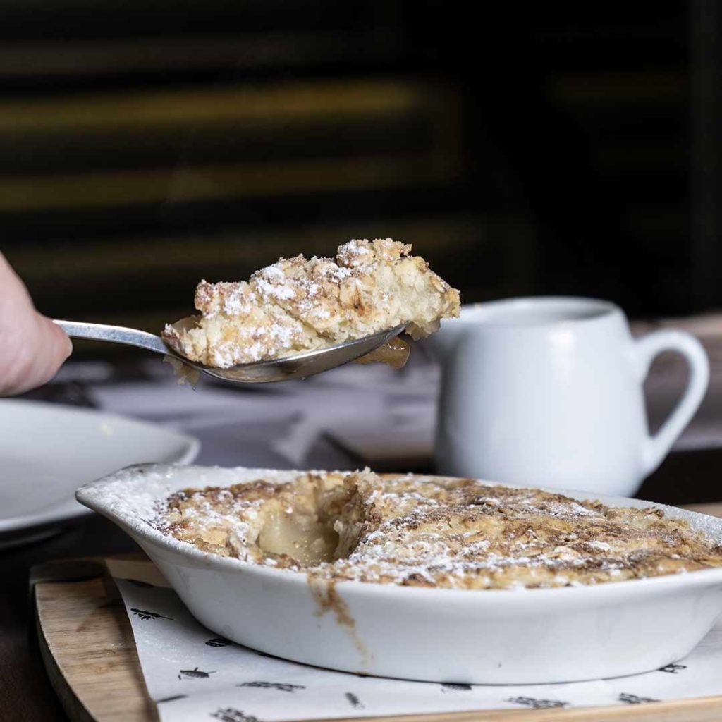 Chef Chris gives a taste of his homeland with a warming apple crumble for dessert. The mellowed tartness of the apples is complemented with the warm sweetness of the cinnamon. Warming with a crunchy crust, this sweet experience is elevated with a side of vanilla Creme Anglaise for a creamy ending to the meal, which tastes just like Christmas.