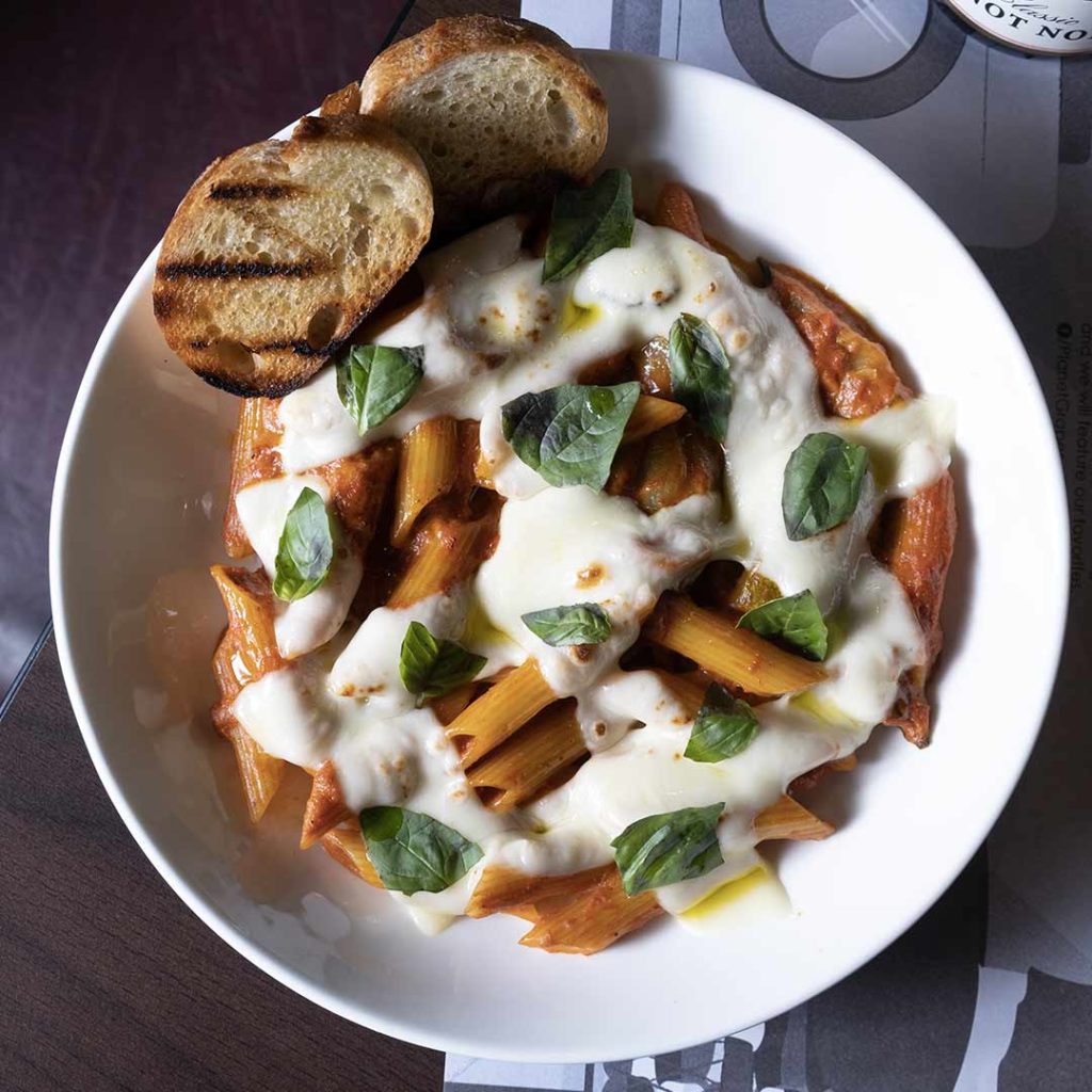 This vegetarian pasta dish doesn’t hold back on flavor with sautéed green zucchini tossed with penne pasta and tomato ragout. The dish gets a creamy topping of grilled mozzarella cheese for a charred savoriness. Though lacking in meat, the dish is still packed with flavor from the grilled cheese and tomato sauce, as well as the subtle savory taste of the sautéed zucchini. The warm freshness of the pasta dish goes well with Hugel Pinot Noir that is intensely fruity which goes well with the pasta’s heavy cheese taste.