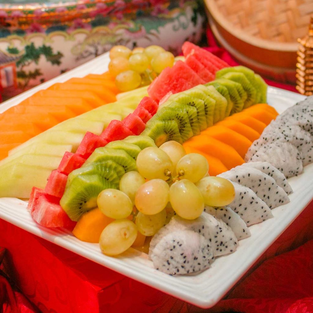 With all the varying sharp and deep flavors Chef Eddie has made in the lauriat, it’s only fitting to end the feast with some fresh fruits to clean the palate and cap off the colorful feast with a colorful platter. Depending on which fruits are in season, the platter can include Dragon Fruit, Papaya, Grapes, Kiwi, Watermelon, Honeydew, and Melon.