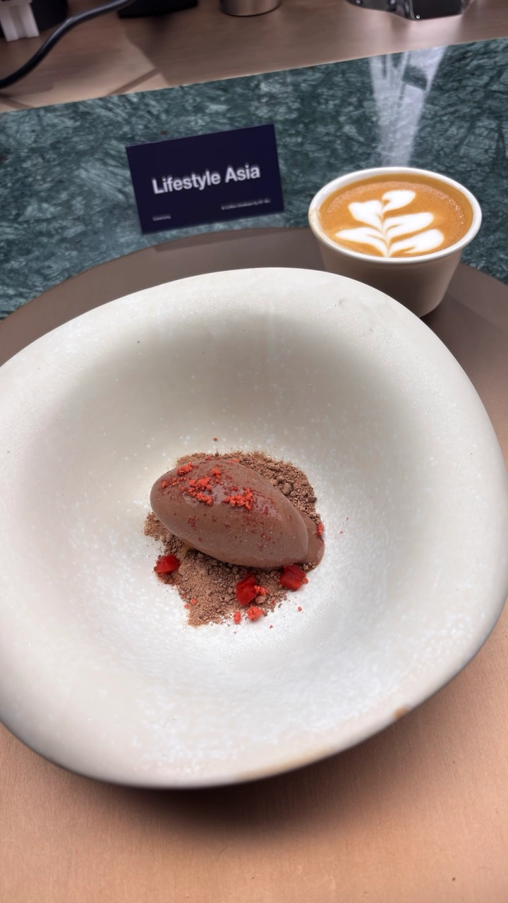 The second “Two to Tango” course was an interplay of milk and espresso, the rich blend consisting of 20% coconut milk, 20% macadamia milk, and 60% luscious full cream milk that added an inventive, nuanced layer to the stronger shot of espresso. A chocolate and honeycomb sorbet with cherries finished it off with a lighter mouthfeel—and transformed the espresso into an affogato for those bold enough to dunk a scoopful of it into their shots.