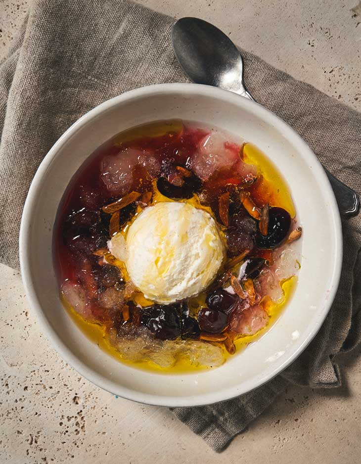 In his version of the cool dessert, Singson makes use of stewed cherries, lime tonka granita, and slivered almonds, which is finished off with olive oil for a bitter, fruity, and nutty note.
