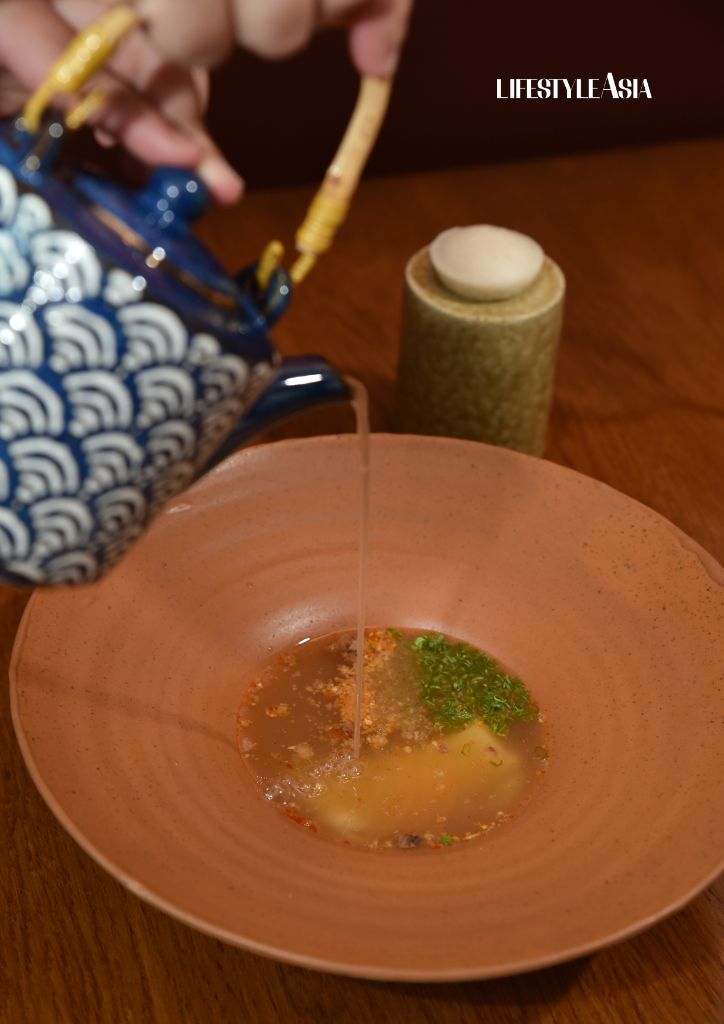 The lunch began with Batchoy at Puto—a popular regional pairing, consisting of pork bone broth with homemade noodles, fried garlic, scallions, chicharon, and crispy pork face, served alongside sourdough rice cake (puto). This was followed by Inasal—skewers of grilled chicken, gizzard, skin, and bottoms basted with an annatto glaze, then served with a side of house chili and garlic-infused coconut vinegar and homemade chicken super stock shoyu.