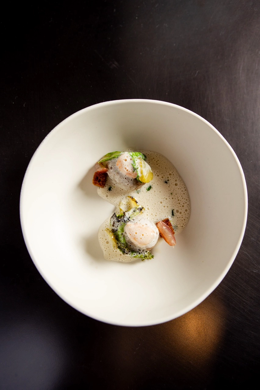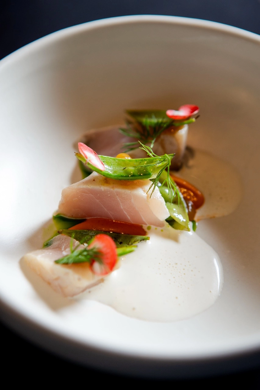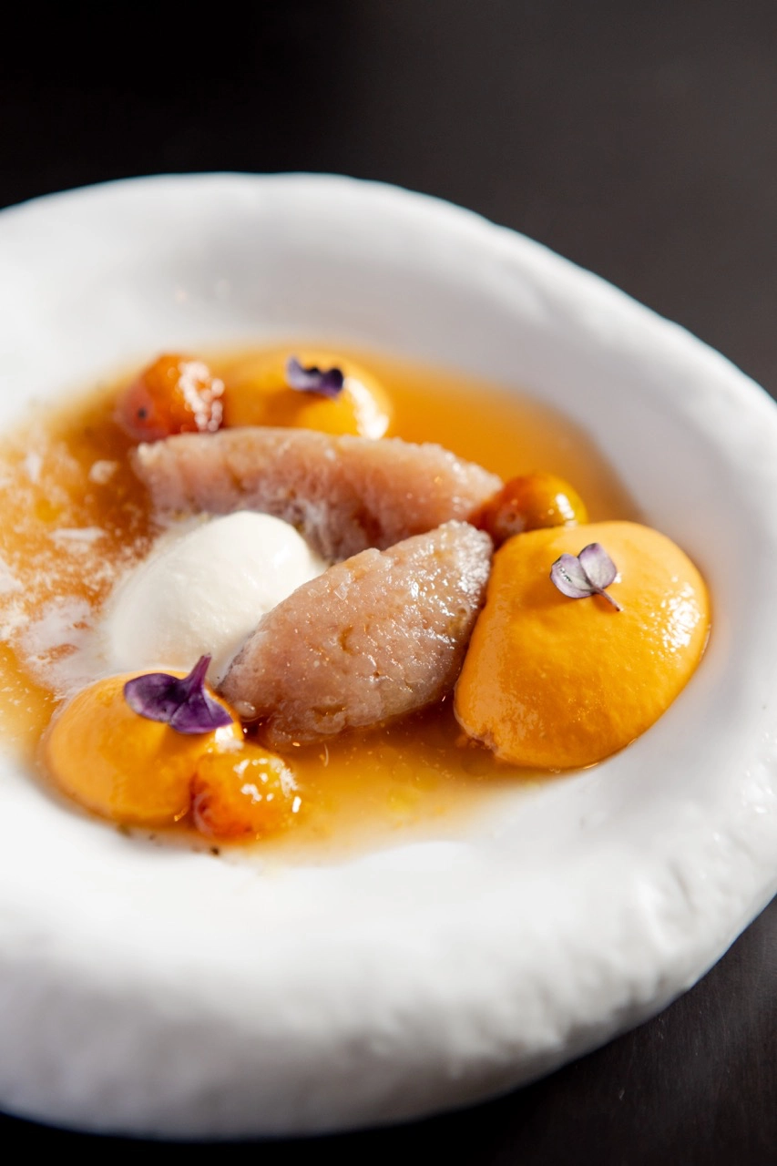 Seafood shines in the new restaurant, a reminder of the richness of the Spanish coast, and by extension, the cuisine born of salt and water. The delicate flavors of the day’s catch are accentuated, rather than overtaken, by subtle yet tasty soups (gazpacho being the cold soup, gazpachuelo being the warmer counterpart). The airy, refreshing summer of Andalucia was distilled into the Atún con Pipirrana y Ajoblanco: raw tuna served with a salmon and olive oil soup sauce, coconut vinegar, whipped gazpacho, and grilled cherry tomatoes.
