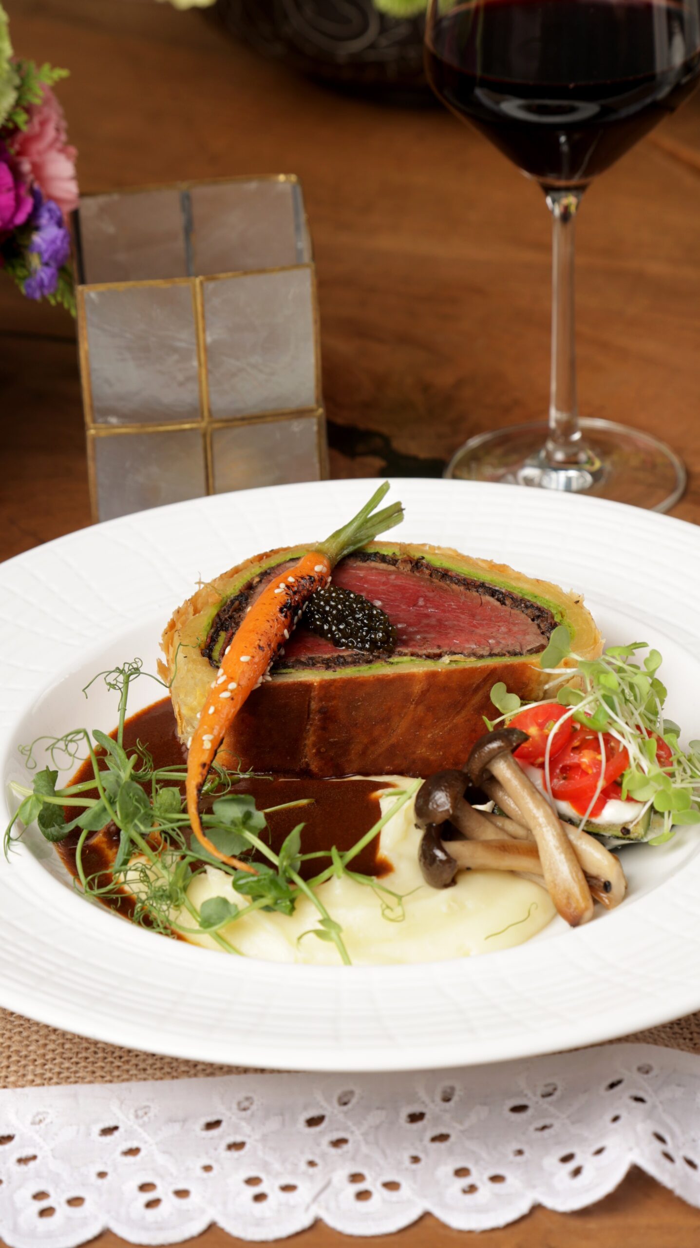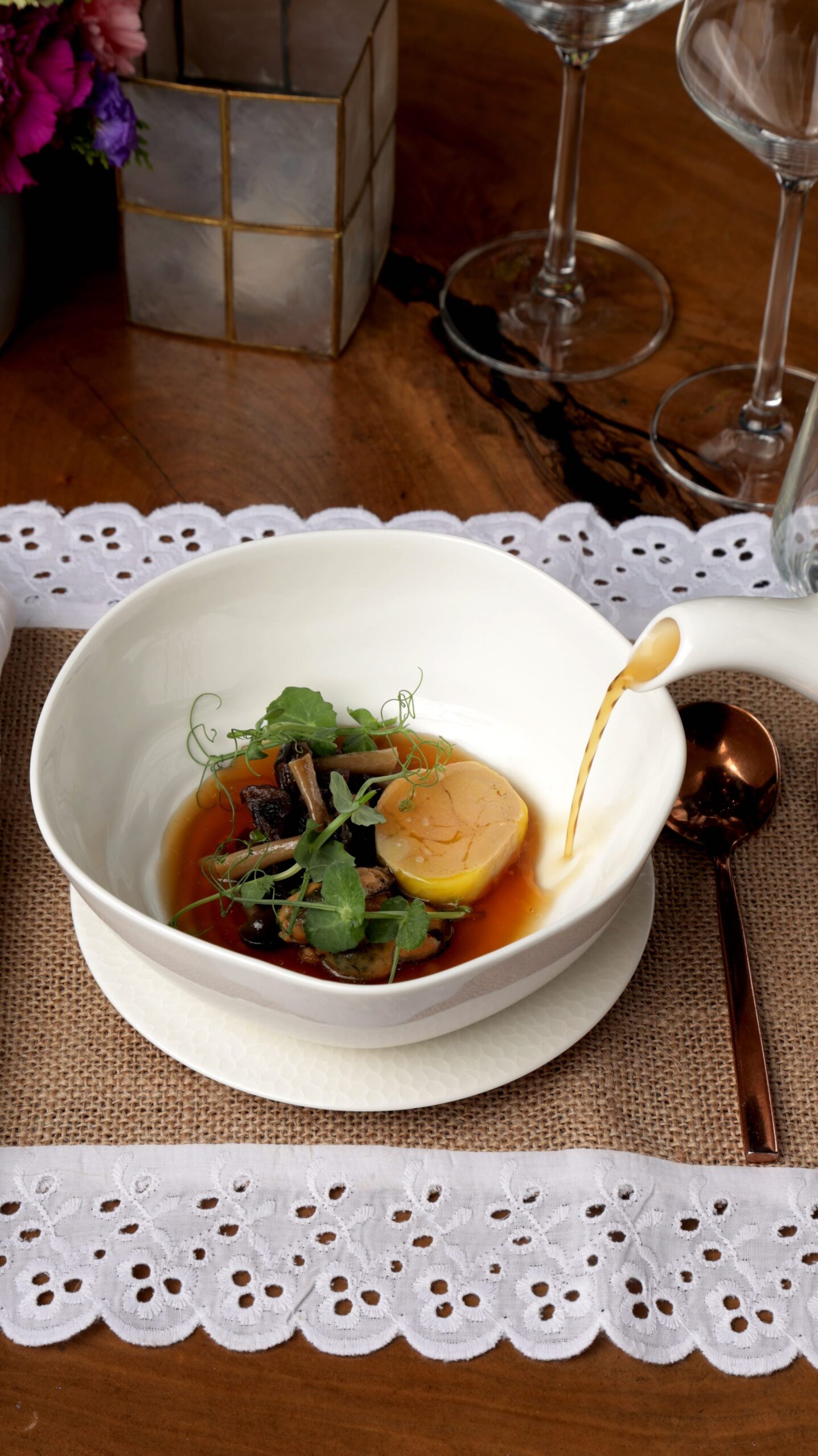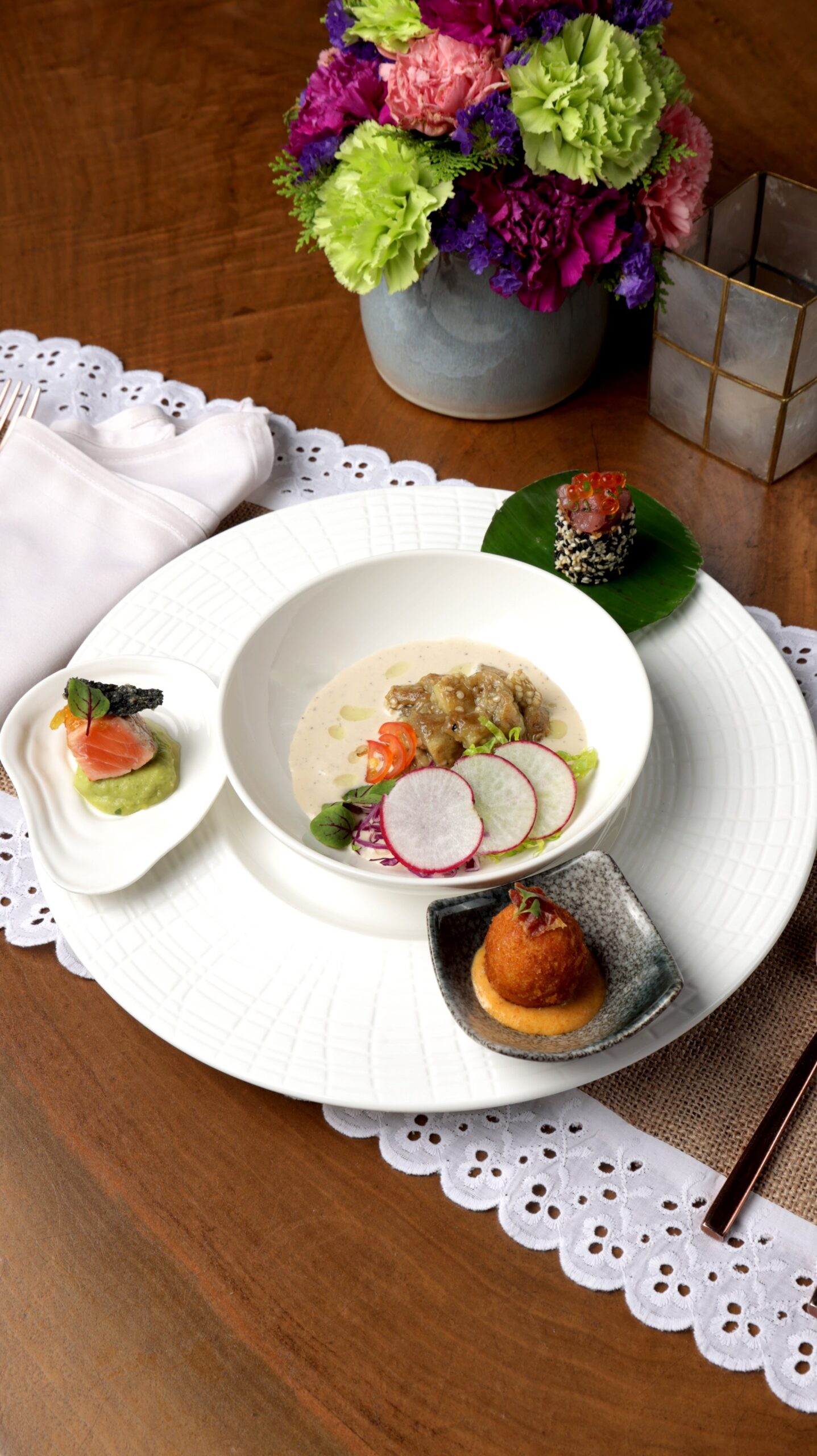 Haliya introduces their four-course dinner with their Prawn and Crab followed by their Mushroom Krema. The main course is Beef Tenderloin with a red wine jus and a symphony of vegetables and saba banana. Dessert includes a decadent chocolate sphere with a red velvet cube, passion fruit and berries, and cotton candy. The restaurant will provide mocktails for diners too.