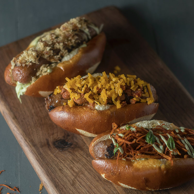 The sausage version of the GMO-free and gluten-free meat alternative also gets the grand treatment served on a mustard pretzel bun and also comes in three variants: Curry, Chili ‘Cheese’, and Tokyo Dog (a topping of vegan wasabi mayo, tempura crisps, and seaweed.)