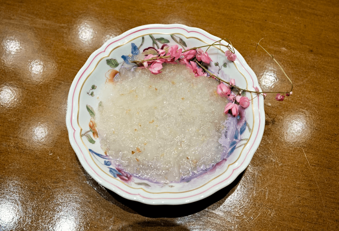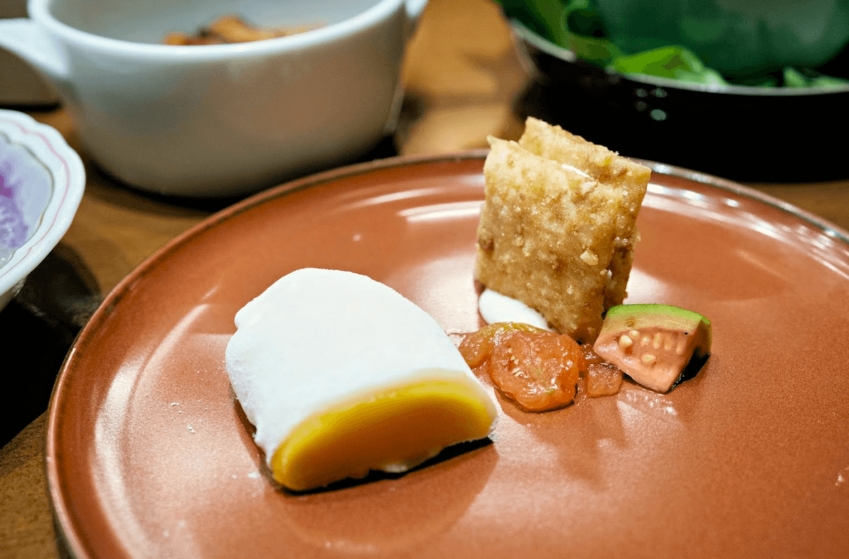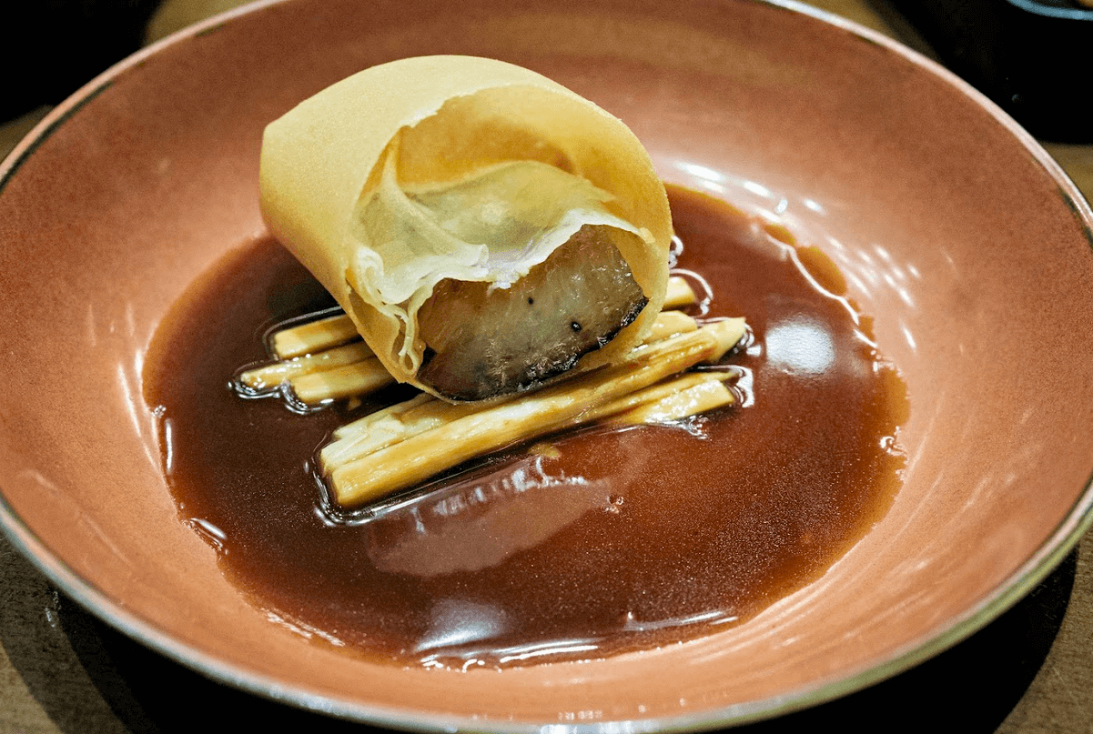 There was a third course before dessert – sea cucumber spring roll with scallion sauce and palm hearts and a pomfret fish pares (a Filipino dish paired with rice) with abalone sauce rice, jackfruit, and preserved turnips.