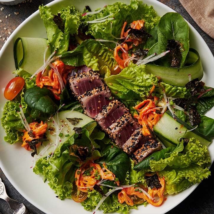 To start, a bright salad of mixed greens, cucumber and tomatoes greets us at the table. Small pockets of spicy kani is added for punch and sesame soy vinaigrette to bring it all together. The protein comes in seared tuna coated with sesame seeds, adding just enough chew and extra nuttiness to the starter salad. A good drink to pair this with is a cooling gin fizz to complement the nuttiness of the dressing.