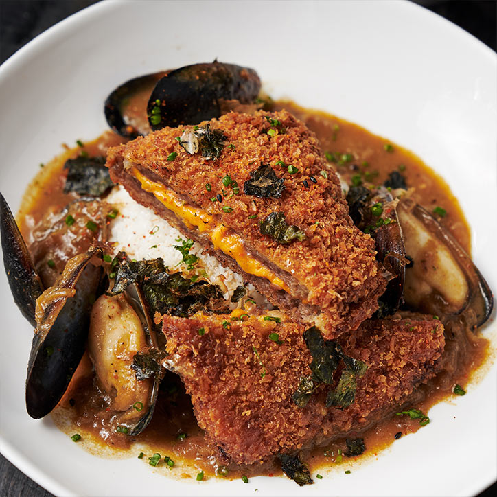 Their Menchi Katsu Curry is where they get playful with the recipe of their dishes. We start with a katsu filled with minced meat and cheddar cheese for a crisp and creamy bite. This is then placed on a bed of rice with a thick curry sauce poured over. For extra meatiness, black mussels are added for a complementing seafood flavor to the rich curry. A good drink pairing with this rich rice dish is an ice-cold Highball.