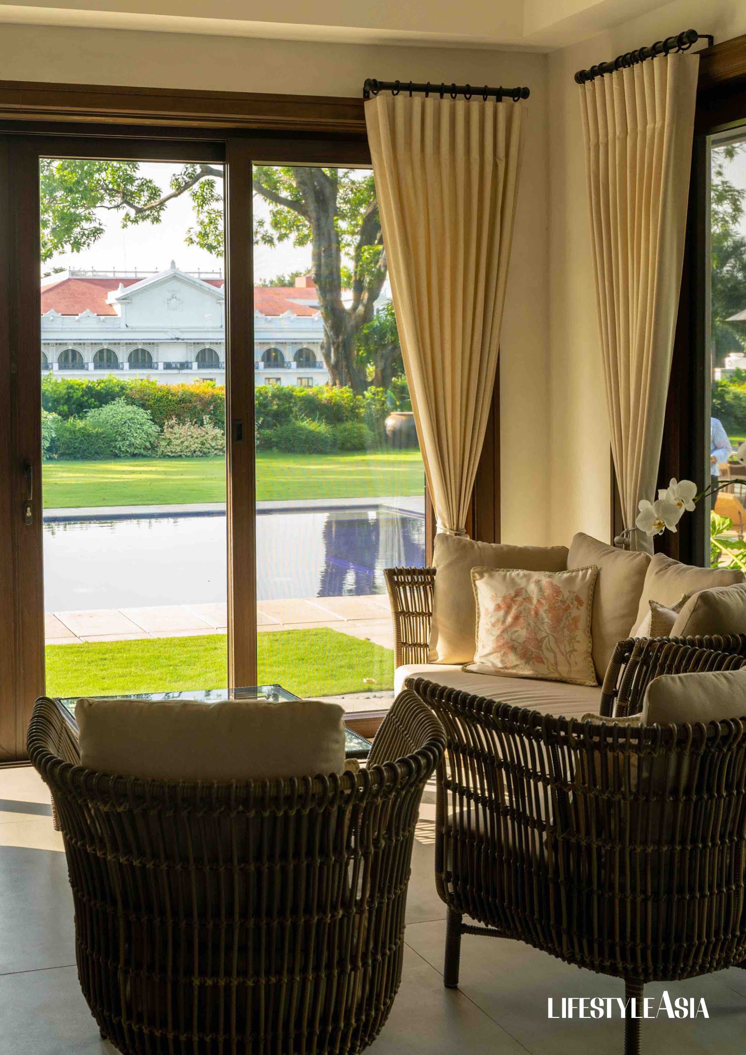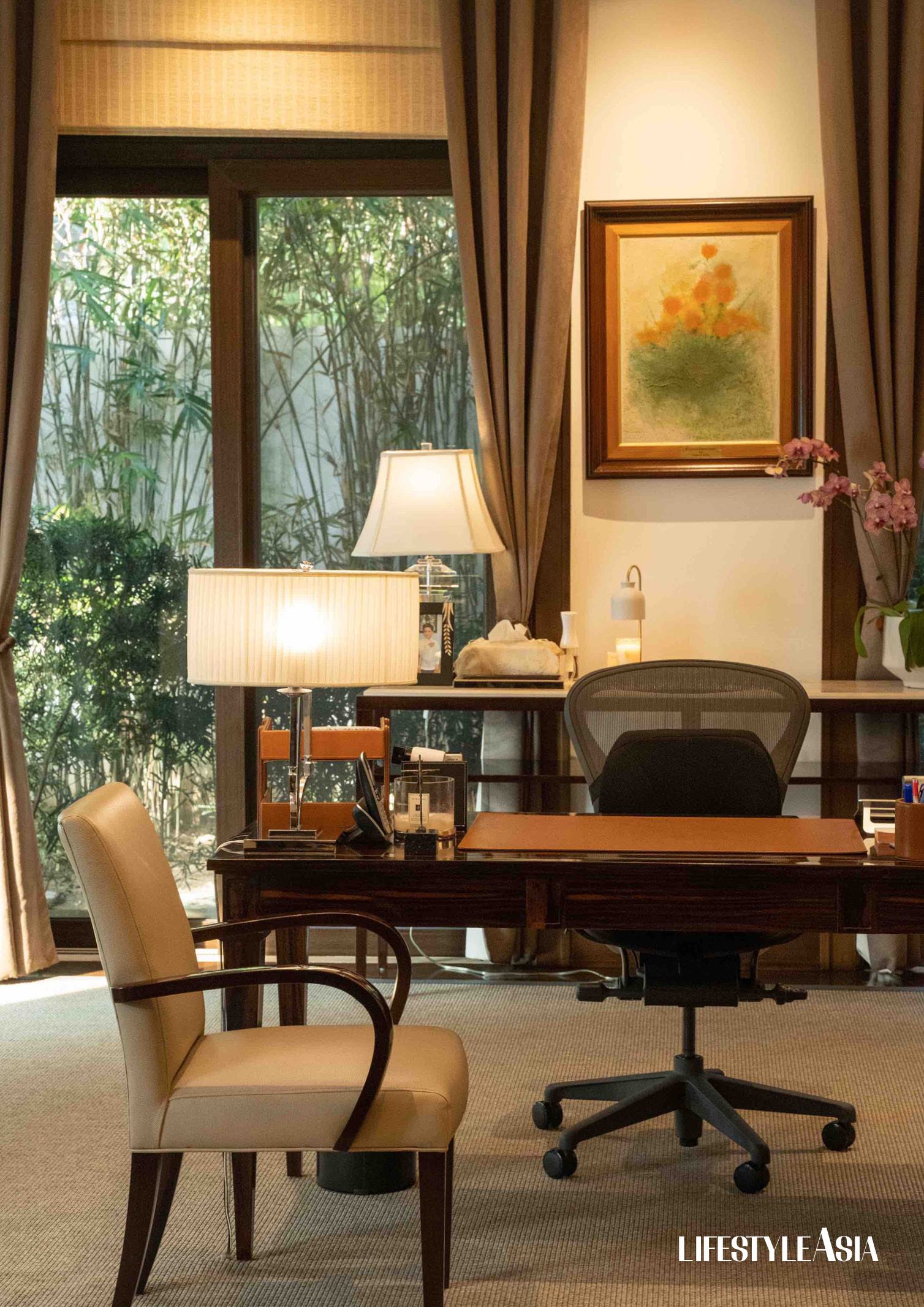 Inside the study at Bahay Pangulo and a calming view of the pool and Malacañang Palace / Images by Gian Escamillas