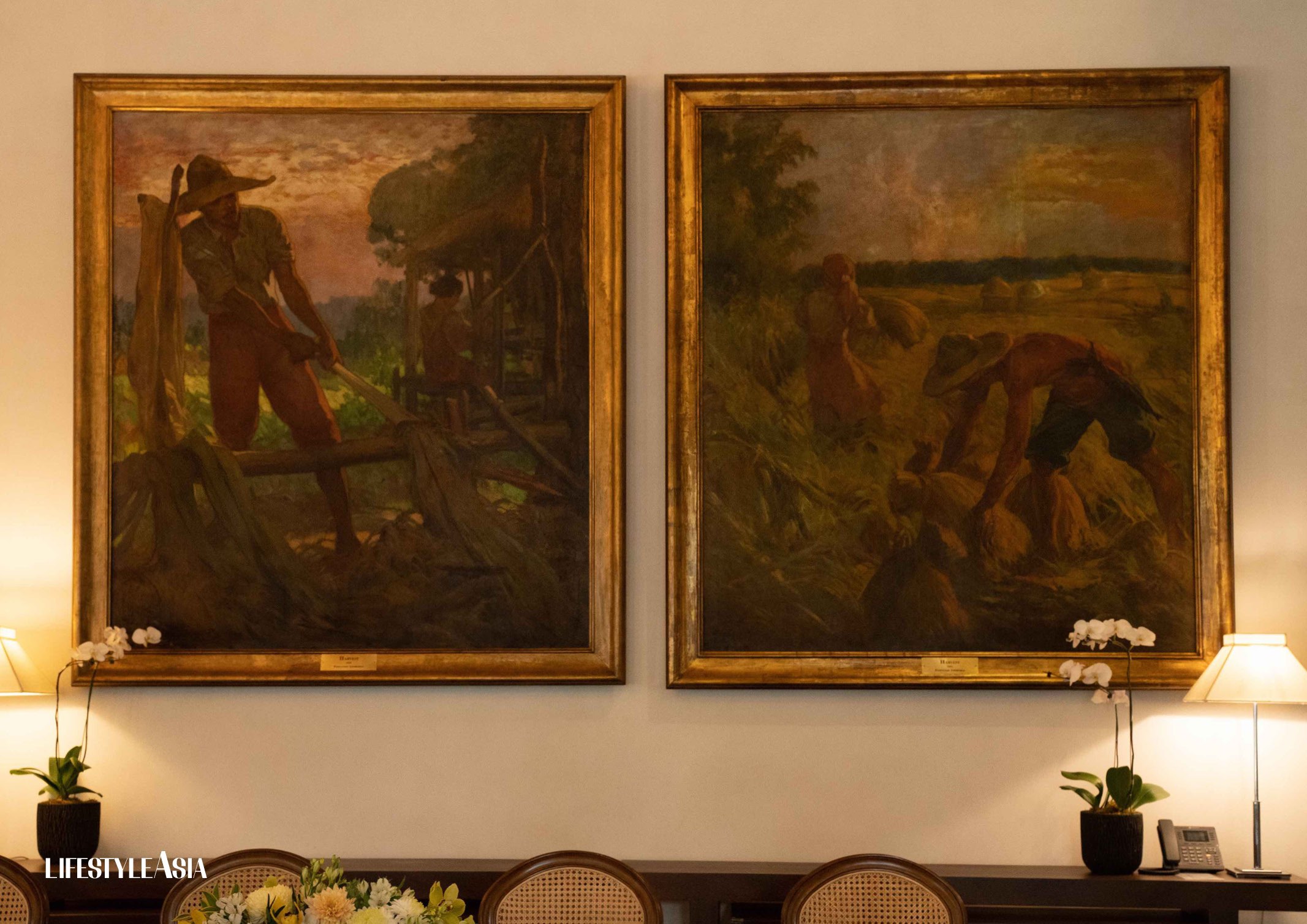 Featured in the dining area are two paintings, both oil on canvas, titled “Harvest,” Fernando Amorsolo, 1931. The first symbolizes the Visayan Island, the second symbolizes the Island of Mindanao. The works of art were exhibited at the Paris Colonial Exposition in 1931. Image by Gian Escamillas