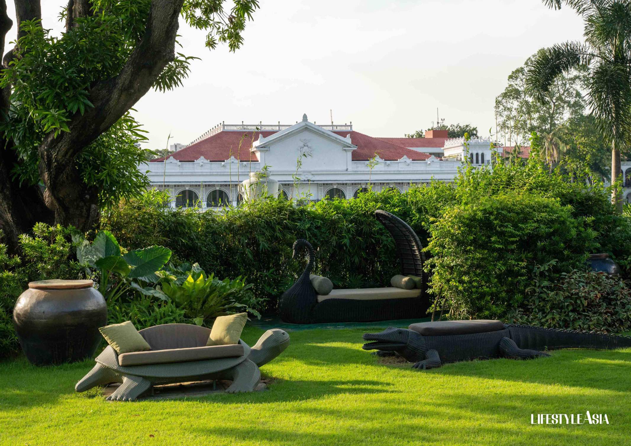 The serene garden at Bahay Pangulo features playful animal furnishings with a partial view of Malacañan Palace / Image by Gian Escamillas