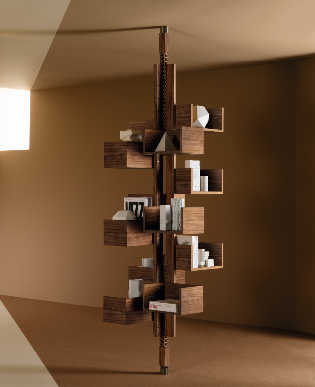 Crafted in solid Canaletto walnut with a rotating 360° structure and meticulously notched columns, this architectural bookcase becomes a striking centerpiece that elevates any collection into art.