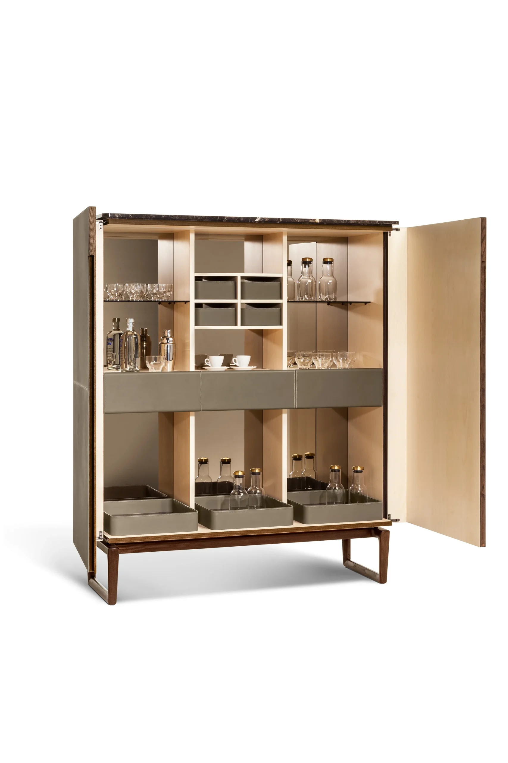 With its leather-clad interior, marble or ash top options, illuminated shelves, and smoked bronze mirrored back, this exquisitely crafted cabinet transforms wine and spirits storage into a luxurious, cinematic experience.