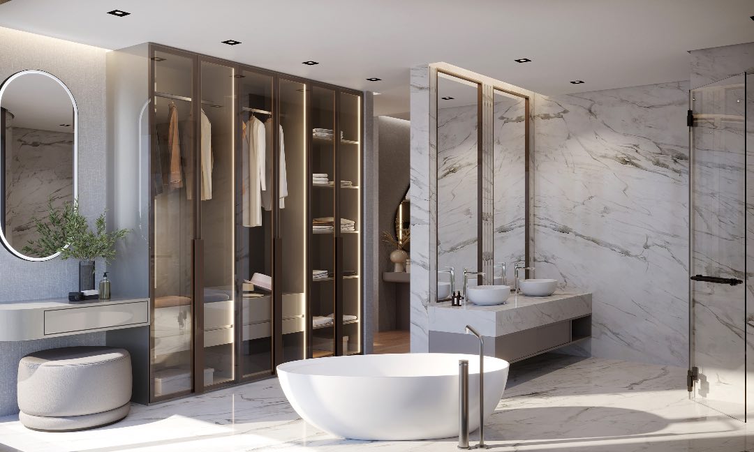 The Silhouette’s bespoke features include European porcelain tile flooring on open areas, flat paint on ceilings and semi-gloss paint on walls. Bedrooms have a more natural feel with engineered wooden planks as the floor surface, and toilet counters have marbled tile finished and a copper-free mirror under warm white cove lighting. The walk-in closet is painted light taupe finished.
