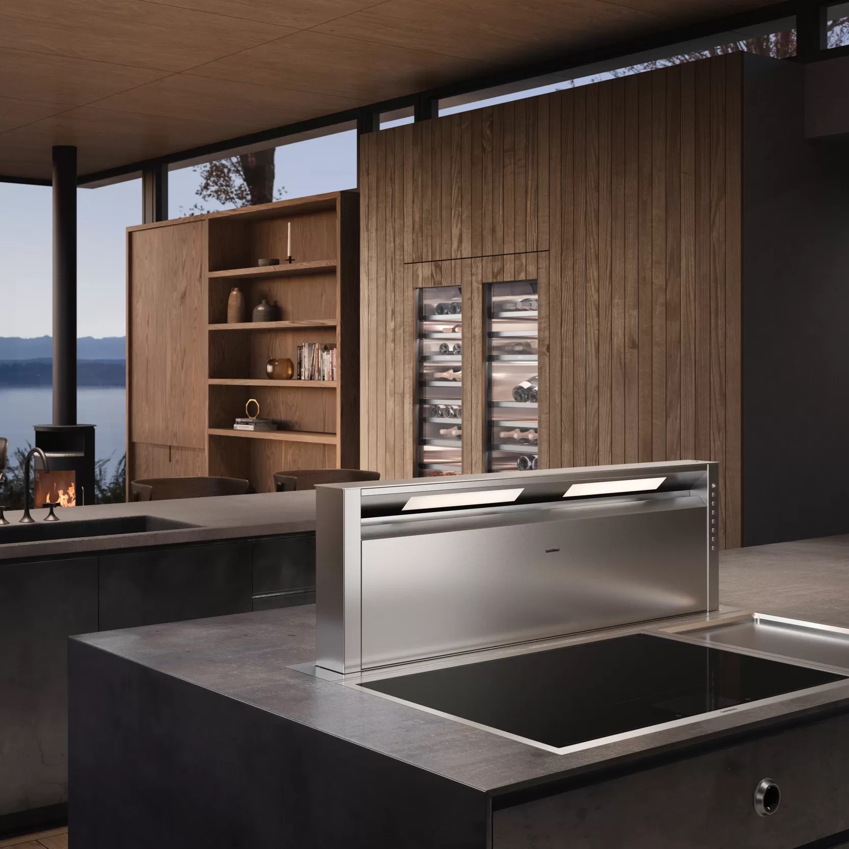 Couples can combine the brand’s modular options and ventilation appliances, creating a kitchen surface that’s all their own. Cooktops are controlled by stainless steel knobs and utilize exceptional materials, all of them made by the hands of skilled craftspeople. Options include the full-surface induction cooktop, Vario flex induction cooktop, Vario gas cooktop, Vario Teppan Yaki appliance, and the Vario electric grill, among others.