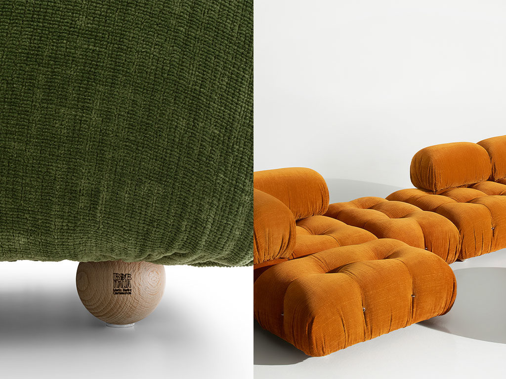 The new edition of the Camaleonda does not look back to the past, but rather it aims to rewrite an indisputable classic in a neoteric perspective. The seat, backrests, armrests, and bases are made of wooden panels. The sofa rests on the floor on a series of spherical feet made of FSC (Forest Stewardship Council) certified beech wood.