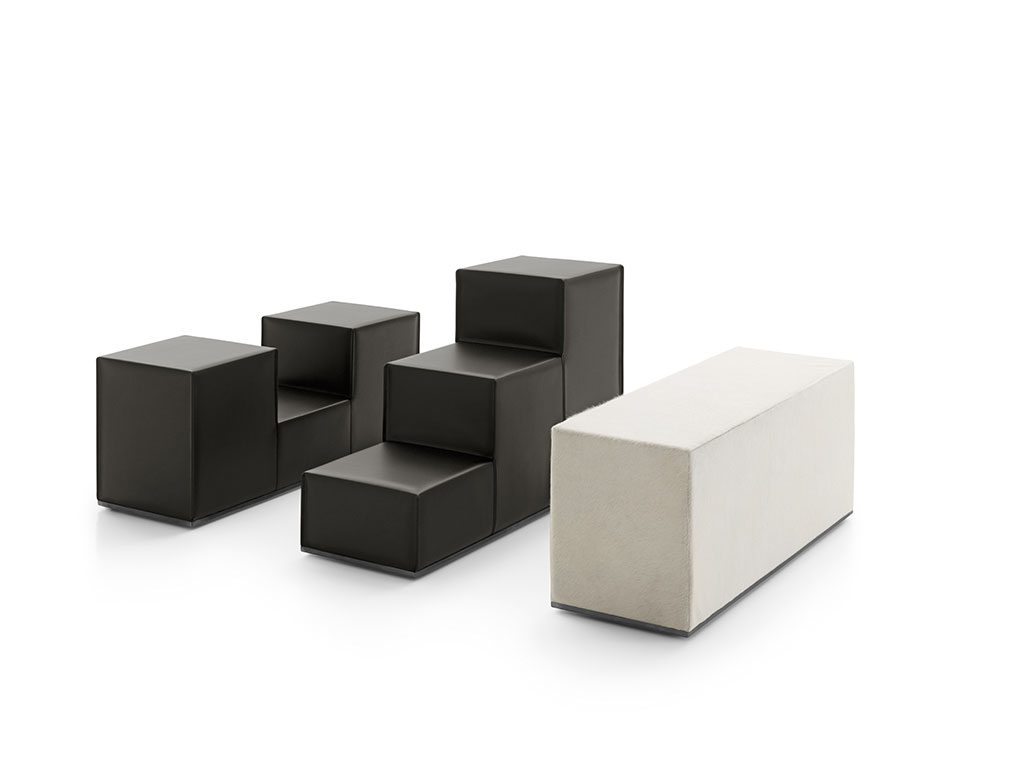 The shape of the three elements elaborates on and develops the parallelepipedon, through structures made of soft polyurethane that perfectly synchronize with the dimensions of the Camaleonda. These accessories also offer soft covers made of thick leather and calf hide with visible stitching. At the base, there is a sleek metallic profile, an element that defines the geometry of the article in contrast with its softness.