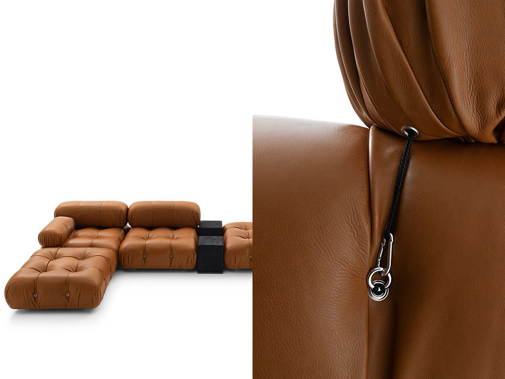 The generous polyurethane padding that forms the characteristic capitonné design remains unchanged. It is still manufactured with the innovative system of cables, hooks, and rings created by Bellini in 1970, which defines the sofa’s character and modularity. Through the tie-rods and the rings, the modules can be unhooked and recombined at will, allowing the sofa to adapt to an evolving taste and to the dynamic needs of those using it.