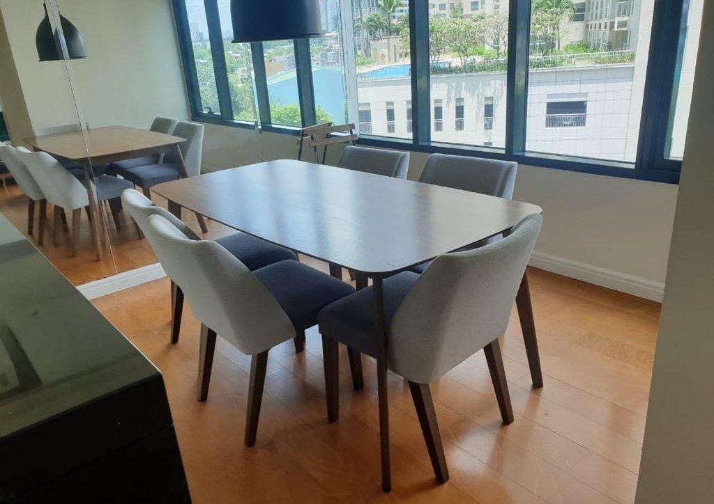 The pet-friendly two-bedroom, two-bathroom unit is located in Makati’s Poblacion. Its amenities include a gym, function room, lap pool, kiddie pool, and a lobby with a concierge.