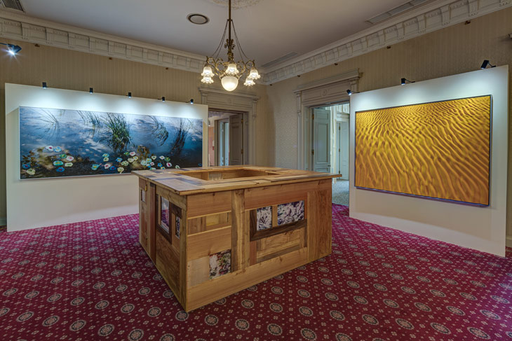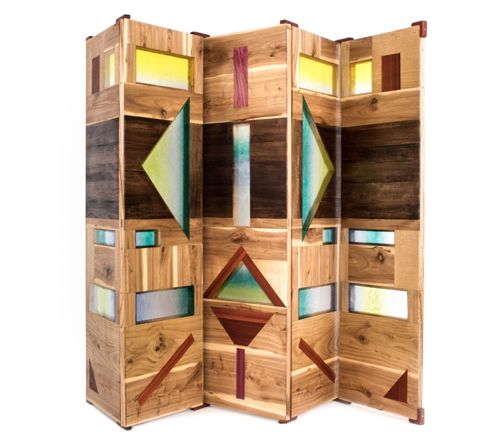 At first glance, these pieces merely look like design, but a deserved second look will have the viewer appreciating the artisanal work that goes into creating these works. A billiard table has wooden shapes that remind of ancient temples, the foosball table is decked with heavy bronze columns, delicate prints on film and Japanese paper on the cocktail bar, and masks made of Murano glass in the paravent.
