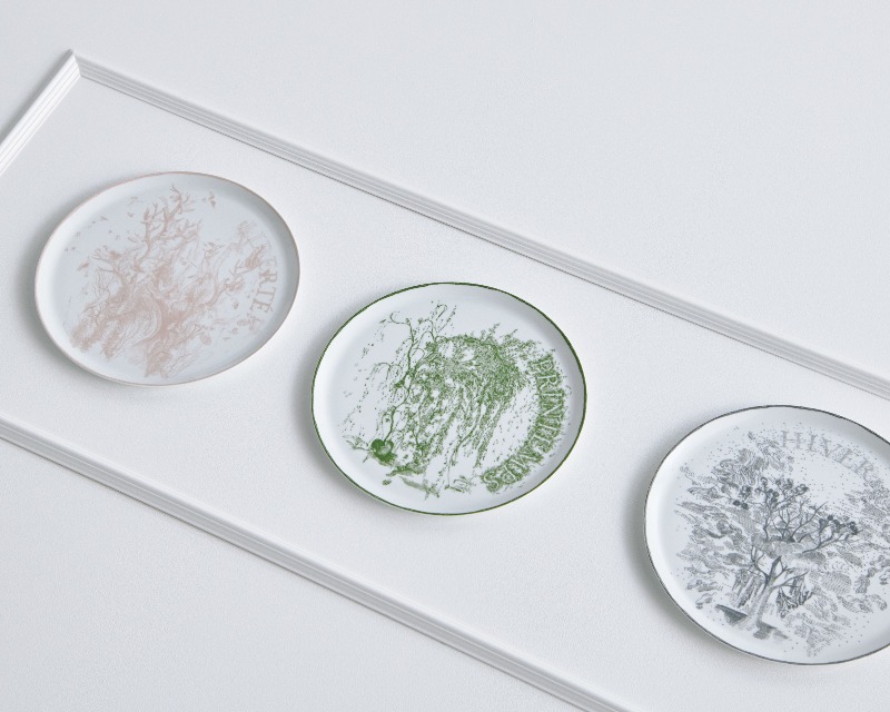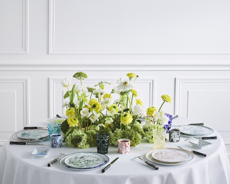 Dior’s new line ABCDior uses its Mitzah scarf collection prints to design functional homeware pieces. The pattern, designed by creative director Maria Grazia Chiuri, is turned into plates, stationery, and candle holders.
