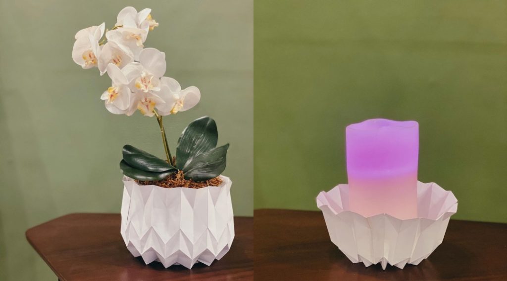 Apart from the plants, he decided to further animate the house through the use of colors. A way to entertain himself as well, he painted on his clay pots. He kept the design to a minimum—spots and splashes in cool hues. He also tried his hand at doing papercraft: folded plain white papers turned into interesting shapes. He used these as holders for small plants and candles, delightful decors from an ordinary household material.