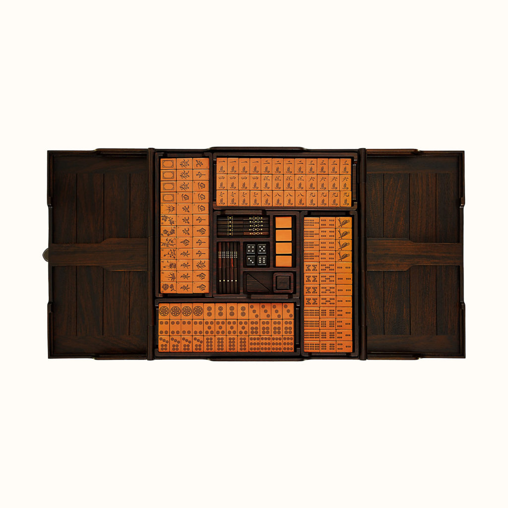 Let’s start with the current star, the Helios Mahjong Set, which is made with solid Rosewood and printed Swift calfskin. The earthy hue of the box beautifully cases the apricot tinted tiles it holds inside. All of the set’s 144 tiles are printed in full leather making for a delicate sound when they are shuffled.