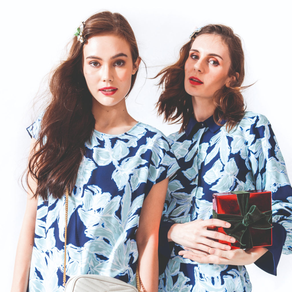 On Adela: Shibori Floral Fluid Crepe Dress, NATORI, Lou Mini Bag in Blanc Vintage, SAINT LAURENT. On Ksenia: Blue Jewels Snap Clip, EVITE PERONI, Shibori Floral Fluid Crepe Shirt, Shibori Floral Fluid Crepe Pants, NATORI.