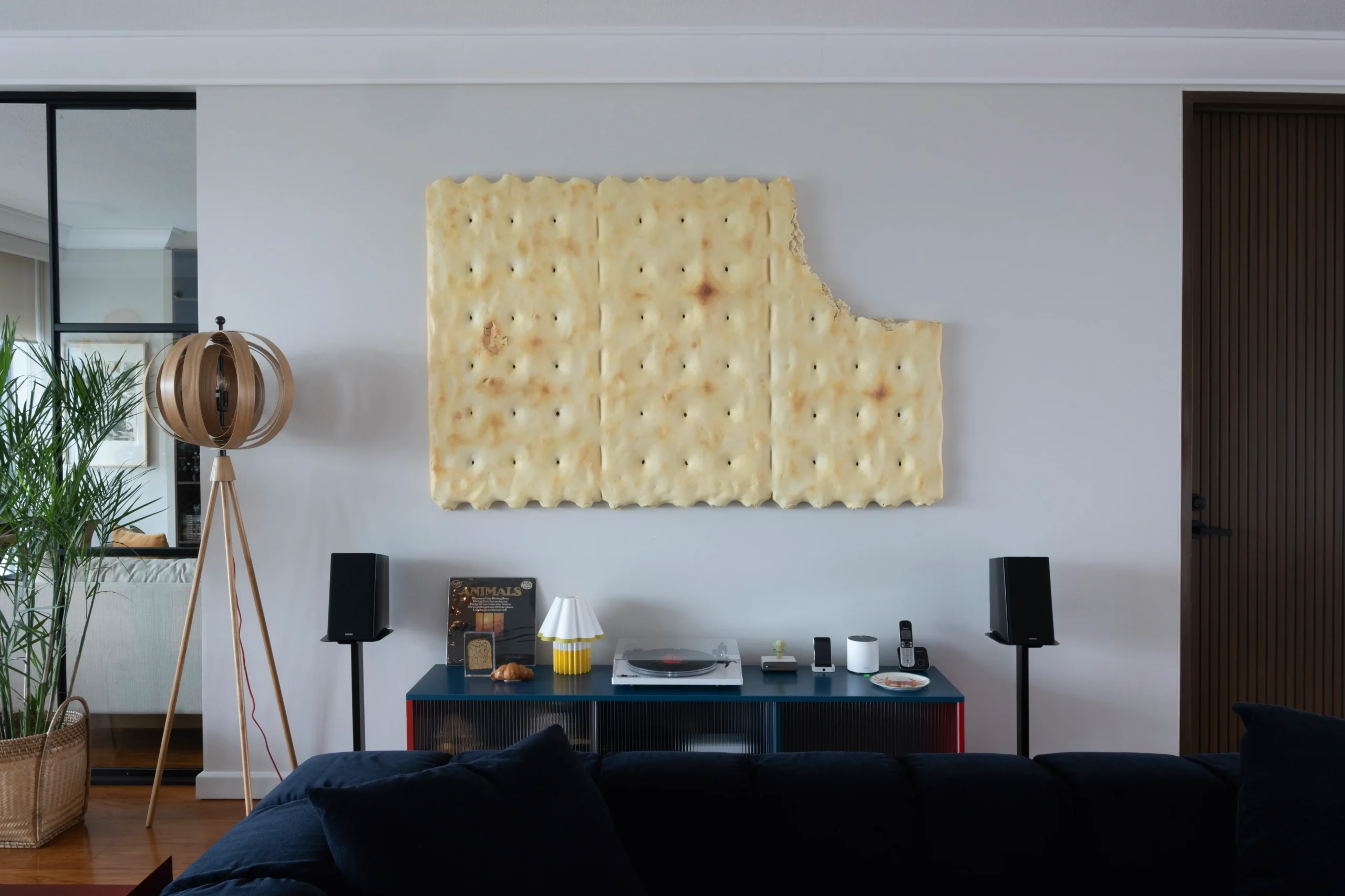 It’s unexpected and familiar at the same time. Linds Lee took a SkyFlakes cracker and transformed it into this monumental piece with incredible detail. You can see every little ridge and hole. It’s nostalgic, it sparks conversations, and it’s the piece that guests are most drawn to when they enter our living room.