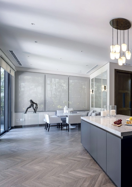 This is illustrated in their kitchen, an area the two love spending time in after work, wine glasses in hand and a meal prepared by the woman of the house. The spacious kitchen opens into their garden and lanai, which reflects their preference for dining outside. “Likewise, even if I mix drinks in the living room as we welcome guests, we all end up drinking around the big kitchen island,” she says.“We get to talk as I cook and they enjoy a selection of Swiss and French cheeses while they wait for the meal.”