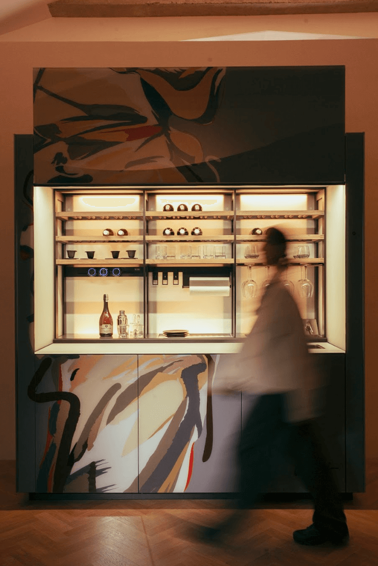 The showroom highlights Vitrum Arte, Valcucine’s unique customization featuring a high-tech wood inlay technique rooted in tradition.