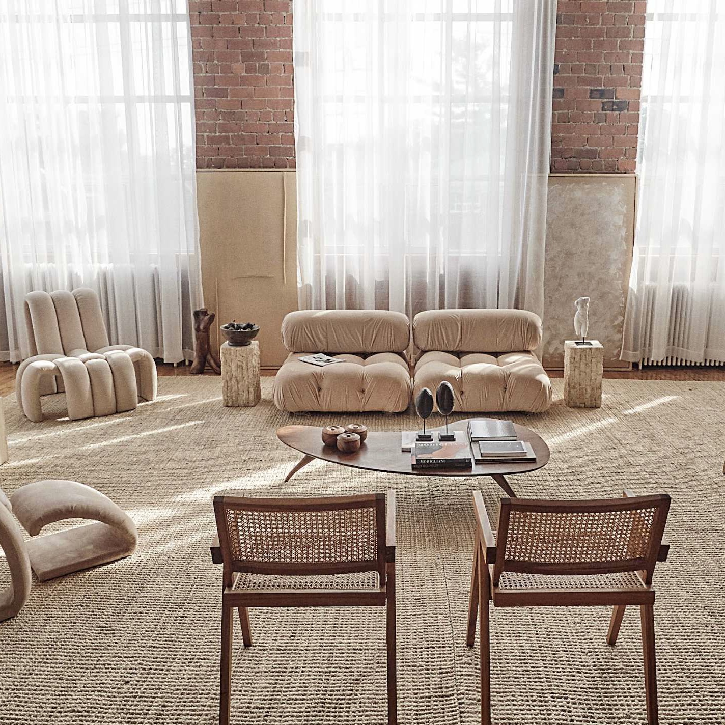 Apart from the earthy colors and organic furniture and decor, the generous distance between the objects create a relaxed and inviting vibe.