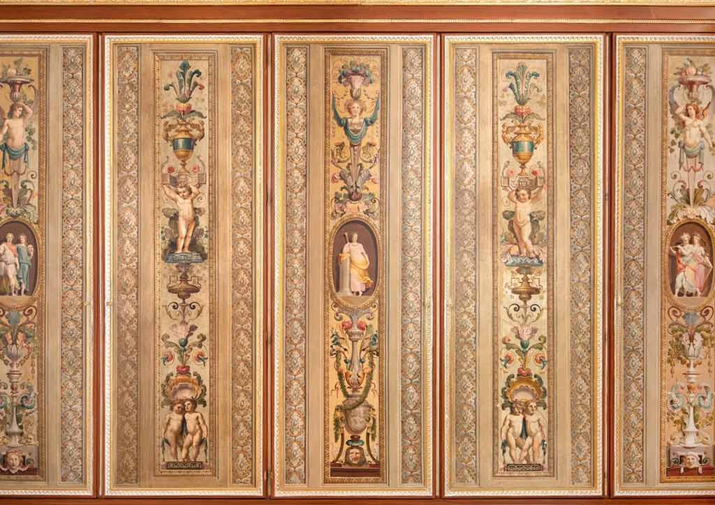 On the third level is a gallery leading to a room with a painted ceiling reminiscent of the Sistine Chapel. This features restored 19th century panels sourced by Versace from a Florentine palazzo showing Elysian scenes.