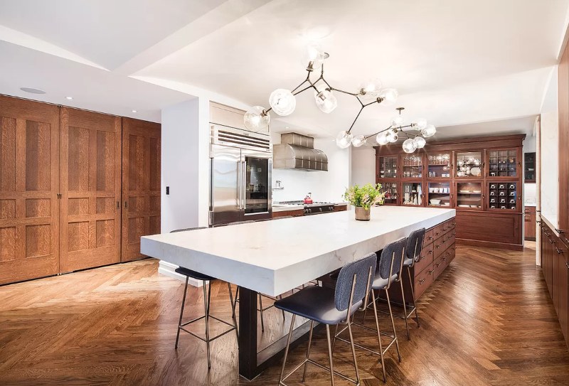 Cabinetry is handcrafted for the kitchen’s interiors, while the center island is made of marble. The chandelier which lights the area is also by a notable New York native Lindsey Adelman.